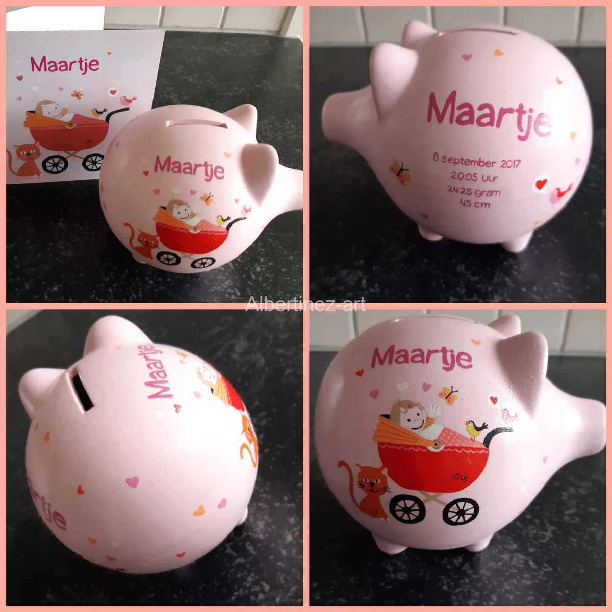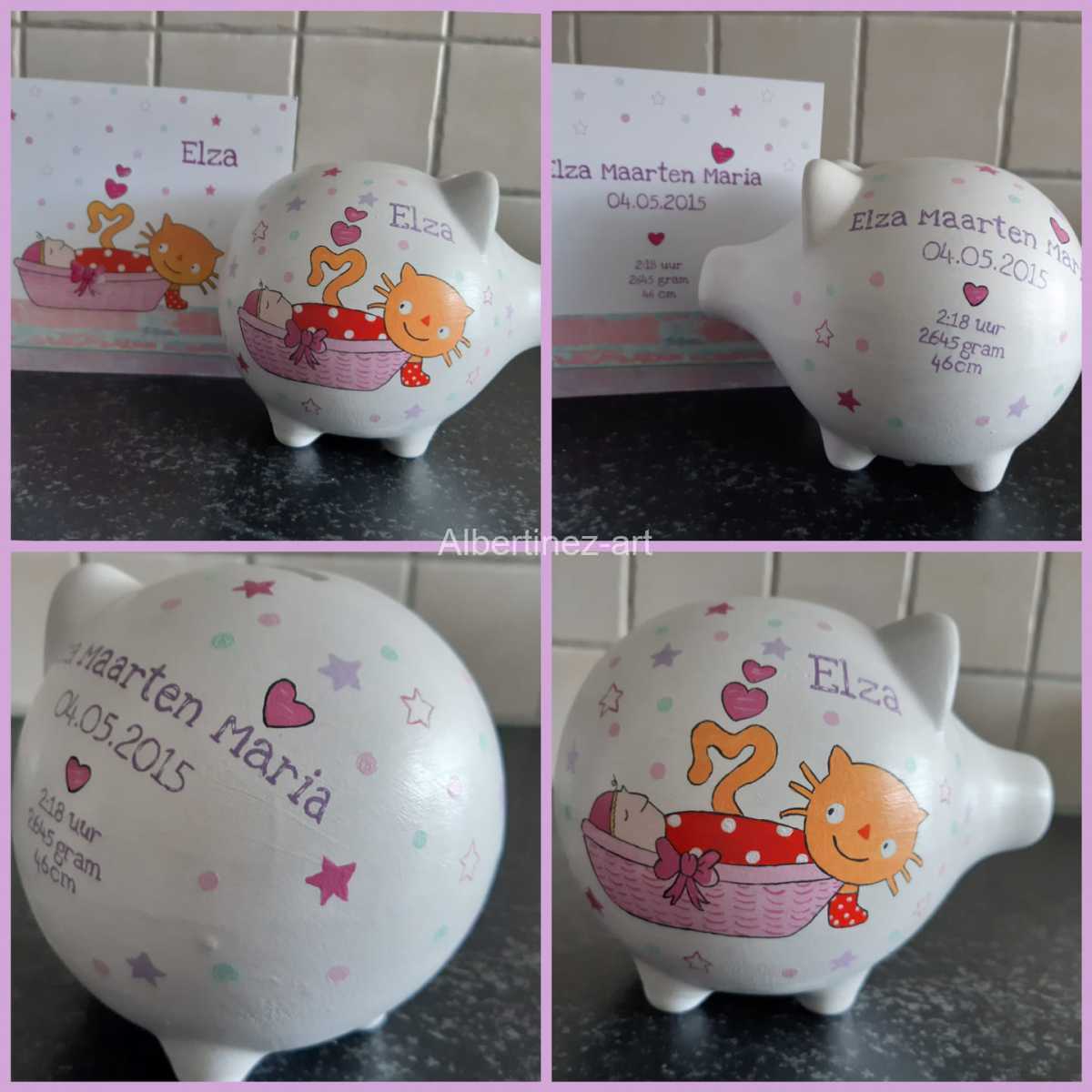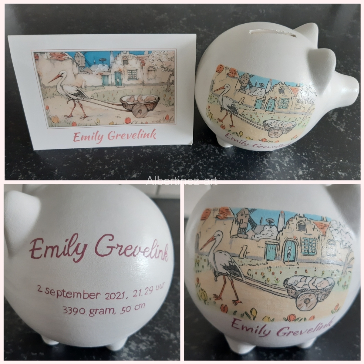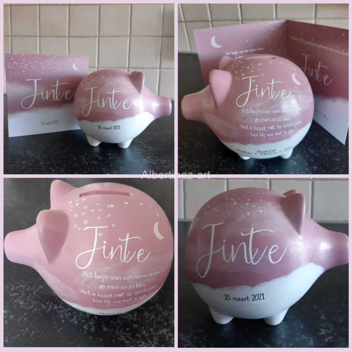 Deze kan worden beschilderd met de afbeelding en gegevens van een geboortekaartje. Maar eigen ideeën en wensen zijn ook mogelijk. Hierdoor is dit leuk om te geven voor bijvoorbeeld een verjaardag of een bruiloft. Ook erg leuk om te geven als kraamcadeau als eerste spaarpotje.