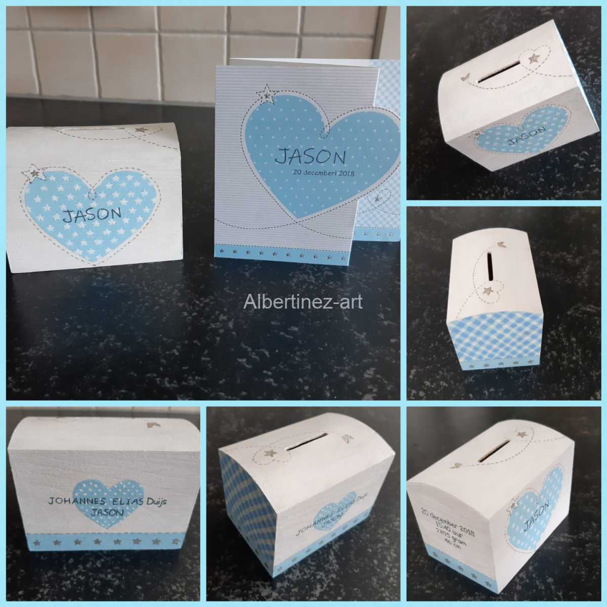Een spaarpotje in de vorm van een schatkistje. Hierop schilder ik op alle 5 de zijdes details van het geboortekaartje.